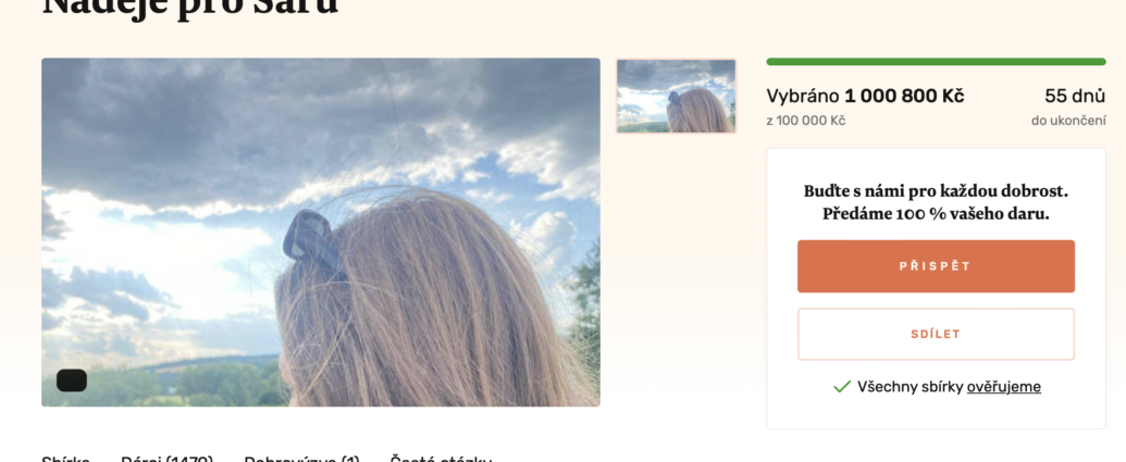 Když se ke mně poprvé dostala zpráva, že pro Sáru byla vypsána charitativní sbírka na psychologa s cílovou částkou 100.000 Kč, měla již nastřádáno 173.000. Později si pamatuji číslo 525.000, také 750.000 a když jsem dostal zprávu od svých blízkých, měla již nasbíráno 853.000. Začal jsem si klást otázky.