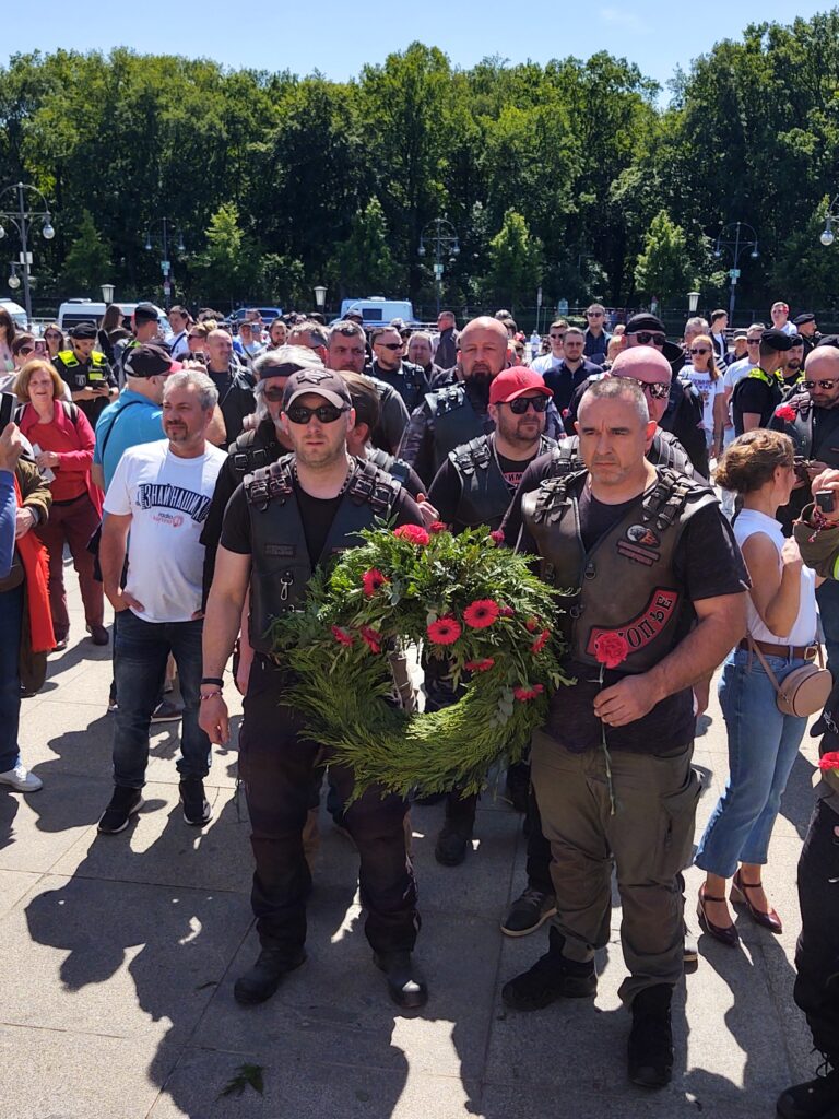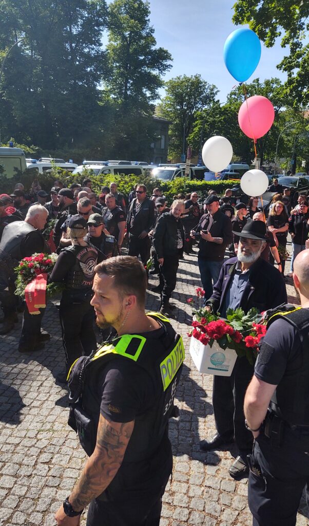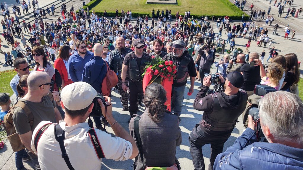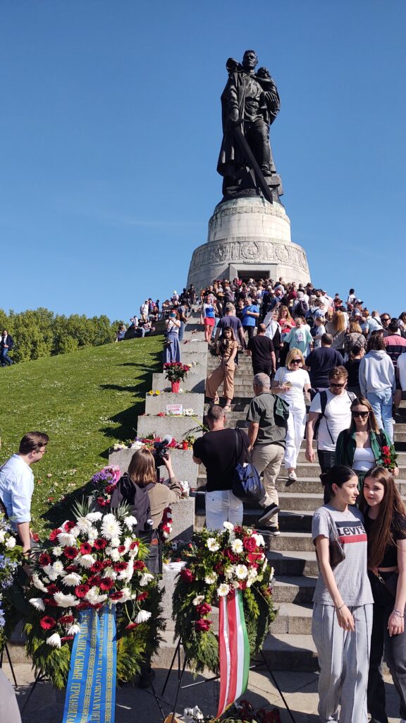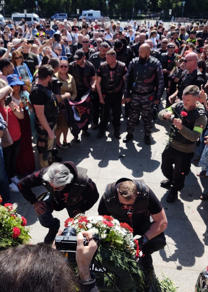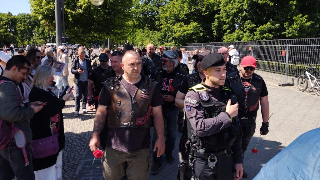Radost z toho asi neměla Policie, která nás od začátku doprovázela, protože po návštěvě prvního pietního místa ve Falkensee, kde Vlci uctili památku veterána Stenzela Christela, německého občana, antifašisty, který ve Francii sběhl od wermachtu ke Spojencům, nás rozdělila do menších skupinek a postupně protáhla Berlínem k dalším dvěma místům. Toto by se dalo pochopit a Policii za to patří velký dík, ale co nedává logický smysl a působí spíše jako provokace, je to, že Vlky nenechali společně uctít památku padlým hrdinům osvoboditelům. Po skupinkách o deseti členech je vodili k památníku a zpět na parkoviště, jedna skupinka se vrátila, nová vyšla. Myslím, že si tím ale nadělali více škody než užitku, protože během té „potupné“ cesty, kdy Vlky vedli k pietnímu místu, je ostatní návštěvníci, a byli jich tisíce, vzývali jako by právě oni byli těmi hrdiny osvoboditeli.