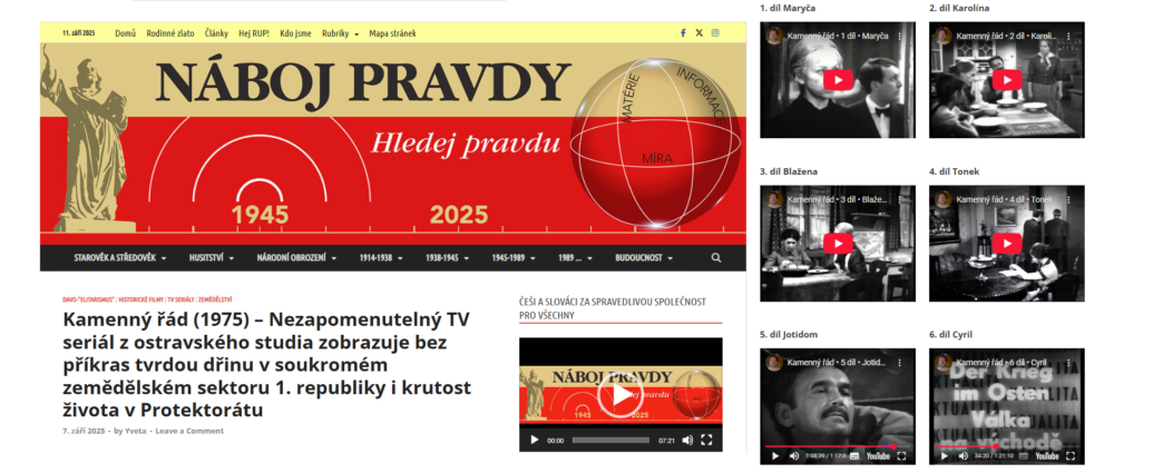 Byla jsem překvapená, protože tento seriál mne z neznámých důvodů úplně minul, takže to pro mne byla premiéra (https://nabojpravdy.cz/11-teorie-rizeni/111-spolecensky-system/1112-davo-elitarismus/kamenny-rad-tv-serial/). Zřejmě se mnoha opakování nedočkal! Velice všem doporučuji ke zhlédnutí, je to velice silný seriál, který dokázal vyvolat atmosféru té doby (odČtěte dále…